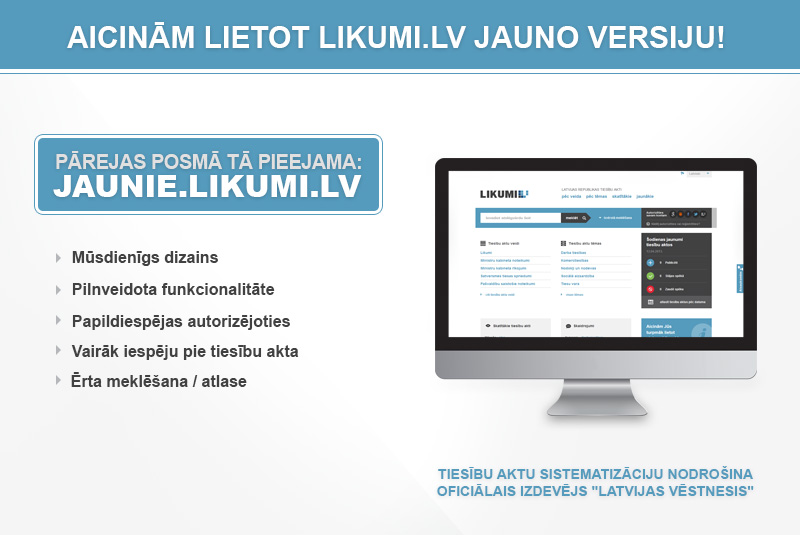 Likumi.lv jaunā versija pārejas posmā (līdz maija vidum) ir pieejama vietnē: jaunie.likumi.lv (kā tests). Pēc pārejas posma beigām tā būs pieejama vietnē www.likumi.lv un nomainīs līdzšinējo versiju.