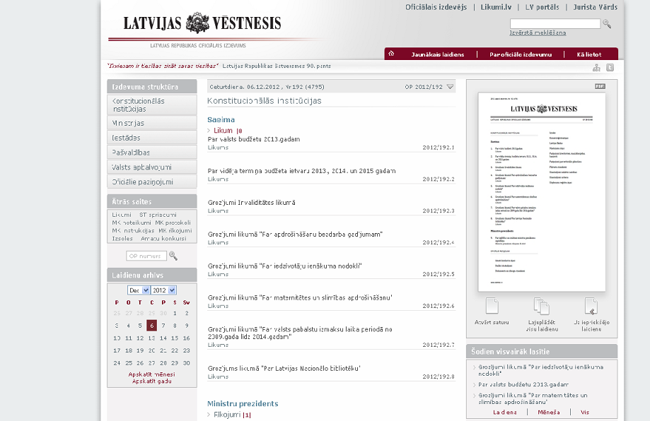 Kopš vasaras Latvijā veiksmīgi darbojas oficiālā e-publikācija. Tas nozīmē, ka oficiālā izdevuma „Latvijas Vēstnesis” laidienam vietnē www.vestnesis.lv ir tāds pats juridiskais statuss kā laikrakstam (oficiālā publikācija papīra formātā; laikraksts turpina iznākt līdz 2012.gada beigām, kad beidzas pārejas posms).