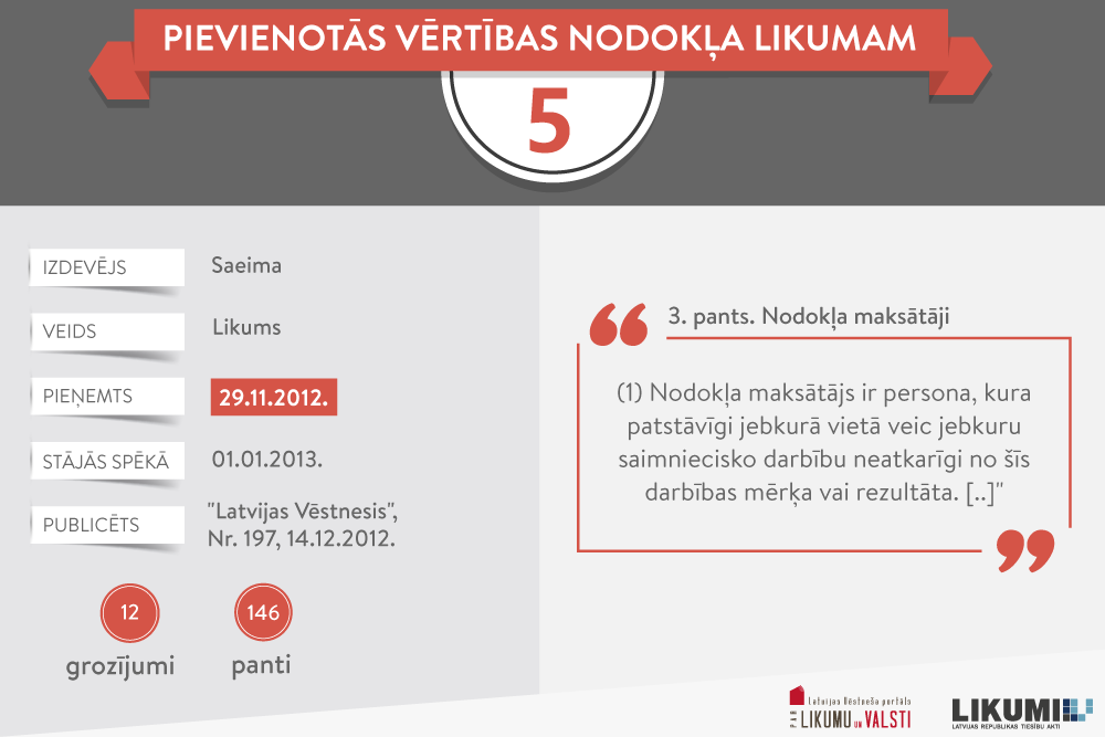 Pirms pieciem gadiem, 2012. gada 29. novembrī, Saeima pieņēma Pievienotās vērtības nodokļa likumu. Jaunā likuma redakcija, salīdzinot ar iepriekšējo, radikālas izmaiņas neieviesa. Tad kāpēc jauna redakcija?