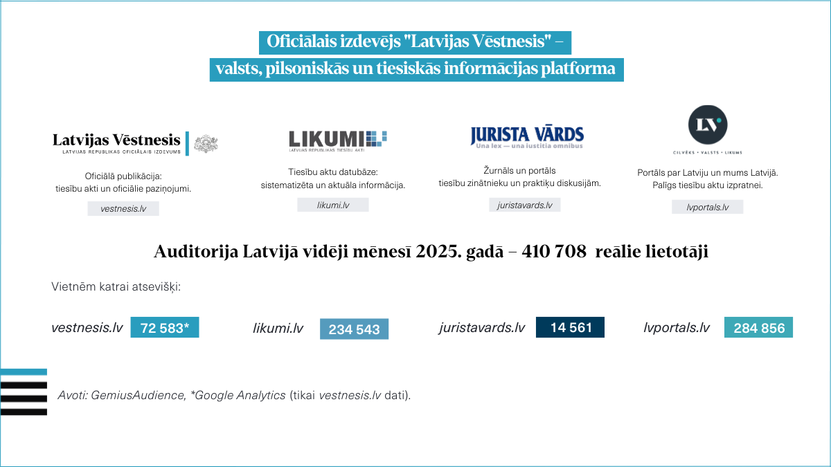 "Latvijas Vēstneša" uzturētās vietnes – vestnesis.lv, likumi.lv, lvportals.lv – un žurnāls "Jurista Vārds" / juristavards.lv veido valsts, pilsoniskās un tiesiskās informācijas platformu. Oficiālais izdevējs "Latvijas Vēstnesis" (OPTIL 14. panta otrā daļa):